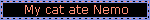 A black blinkie that says "My cat ate Nemo". Nemo is a clowfish from the animated movie Finding Nemo.