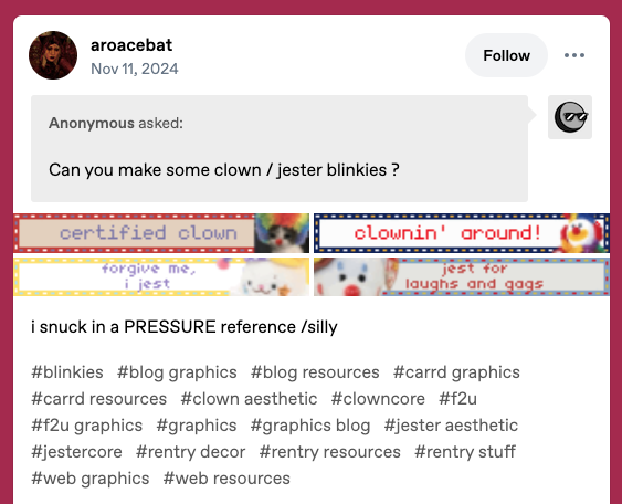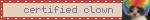 A light brown blinkie that says "certified clown" with a picture of a cat dressed as a clown to the right.