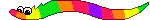 A transparent blinkie of a "worm on a string" toy with rainbow striped fur.
