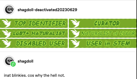 A green blinkie that says "DISABLED USER" with a white dove on the left. The dove is the logo for Inaturalist.org.