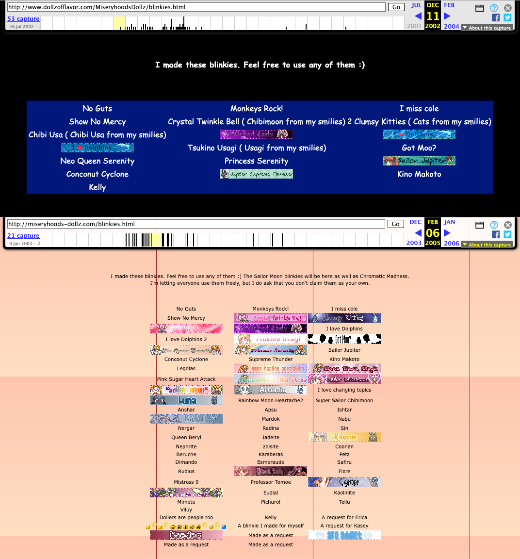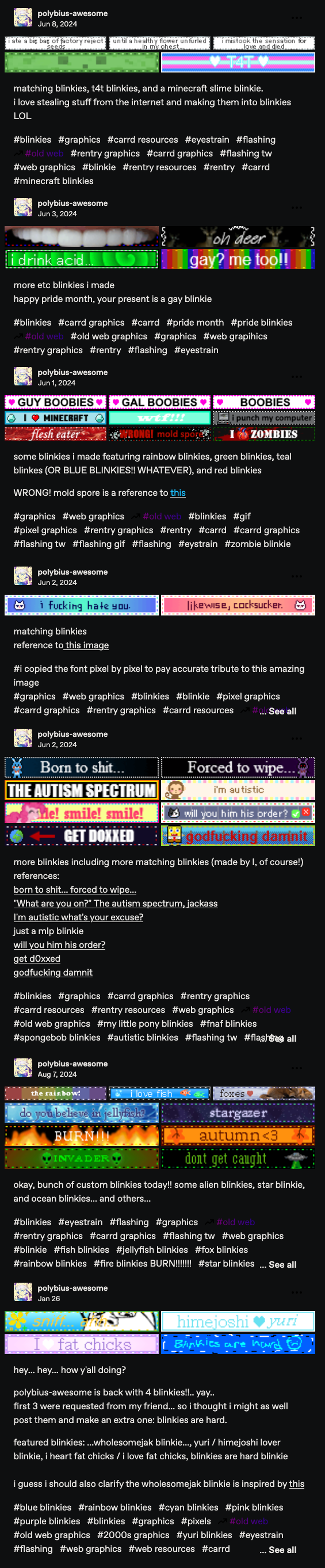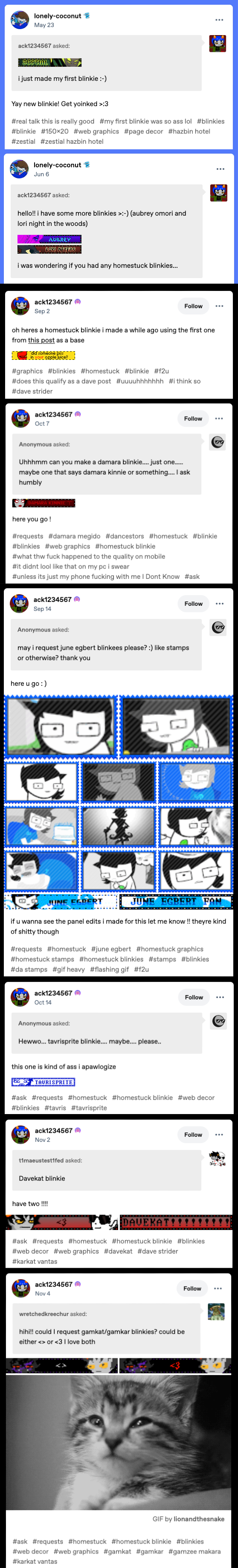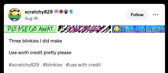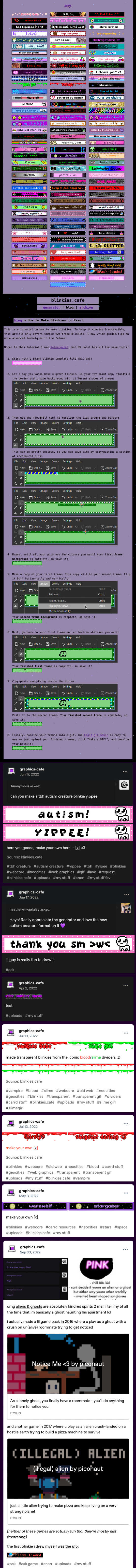 Every blinkie is linked directly to it's creator! If the link is broken, their credit information is still there in form of a name, and a screenshot to prove the credit's authenticity. If you hover over a blinkie (or click on mobile), you can view a dropdown menu that says who created it, information about the blinkie itself, it's screenshot, and sometimes other versions of the blinkie, like different sizes or it's creation file!