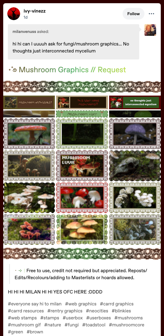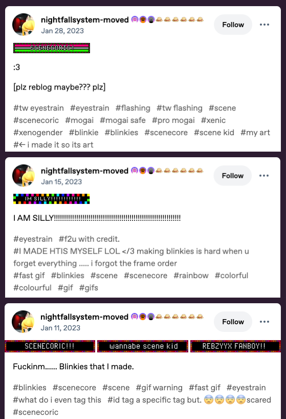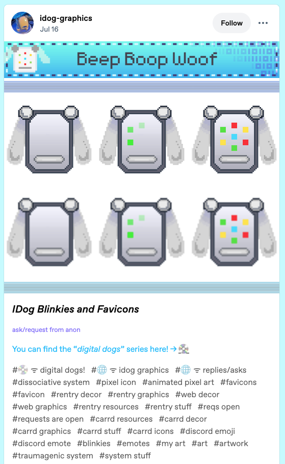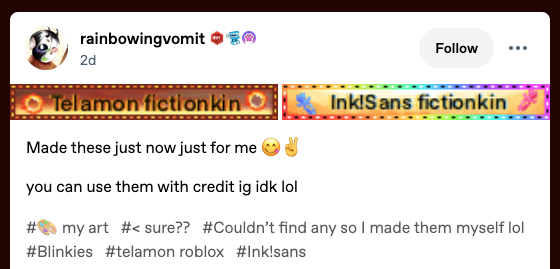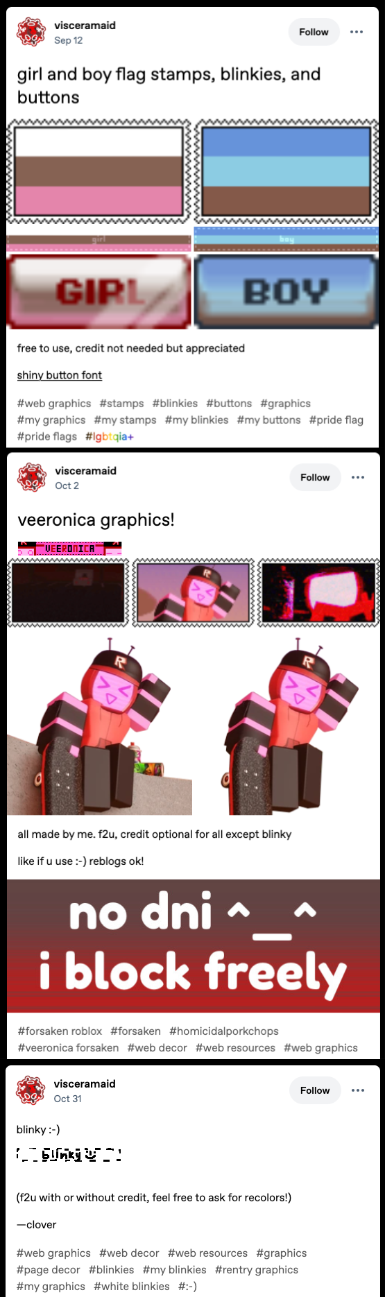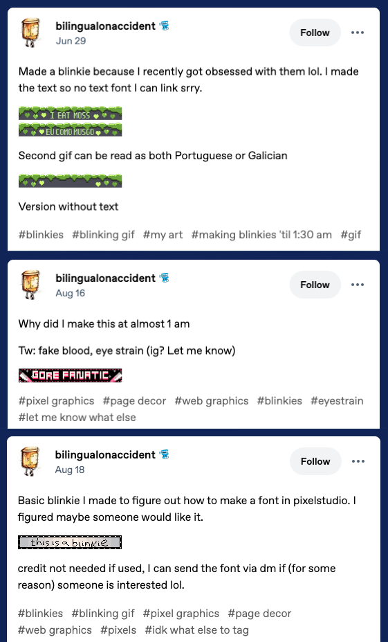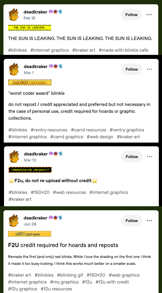 Every blinkie is linked directly to it's creator! If the link is broken, their credit information is still there in form of a name, and a screenshot to prove the credit's authenticity. If you hover over a blinkie (or click on mobile), you can view a dropdown menu that says who created it, information about the blinkie itself, it's screenshot, and sometimes other versions of the blinkie, like different sizes or it's creation file!