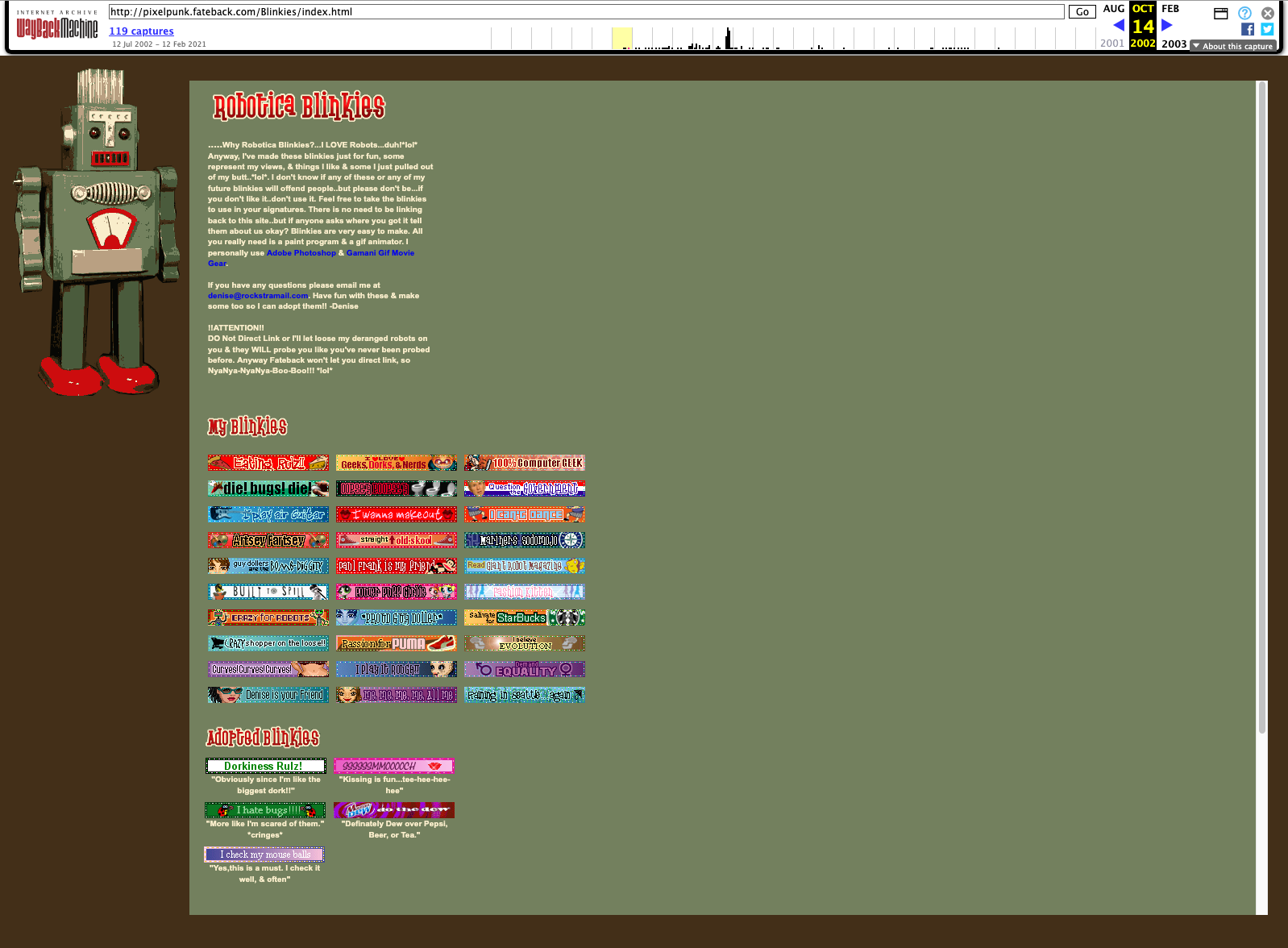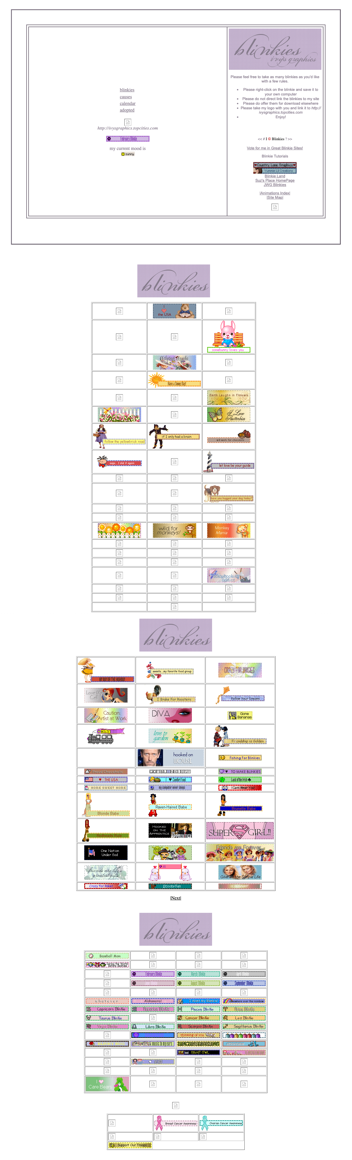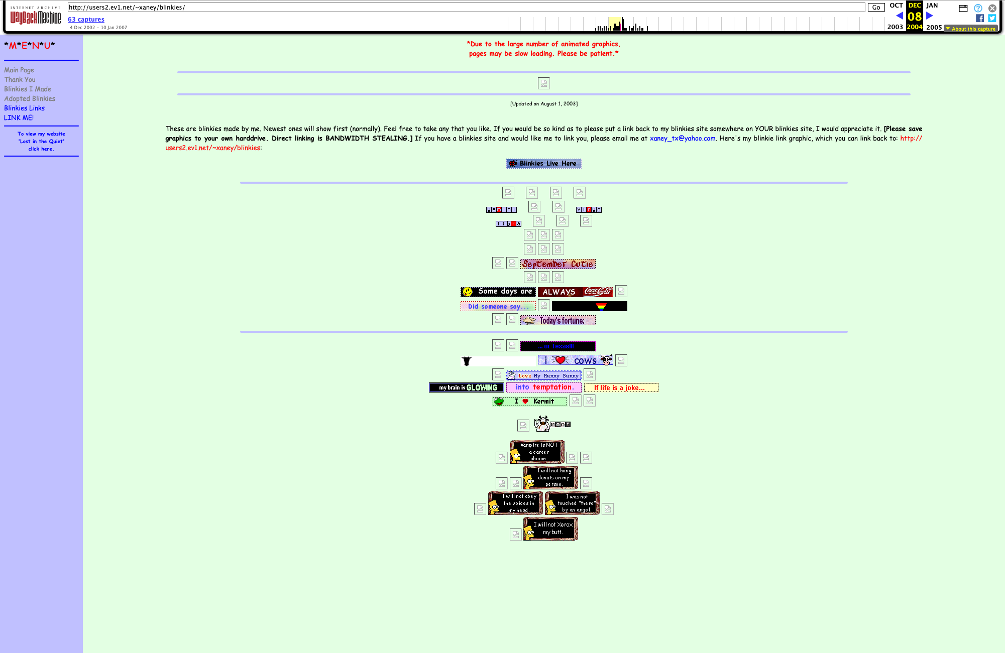 Welcome to Blinkie.World, my blinkie collection site! Here I aim to collect every blinkie on earth, while making sure all of them are credited to their creator! Many of these blinkies are from sources that no longer exist, so this not only a directory, but also an archive! Here, these blinkies (and who created them) shall be immortalized forever!