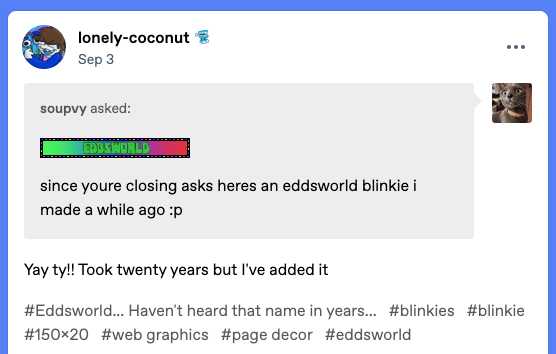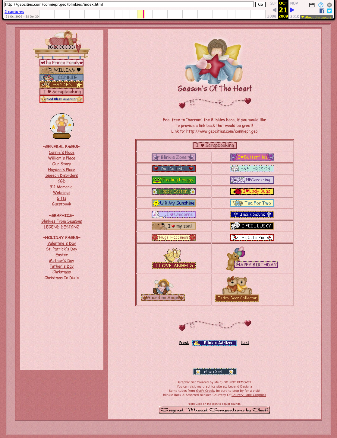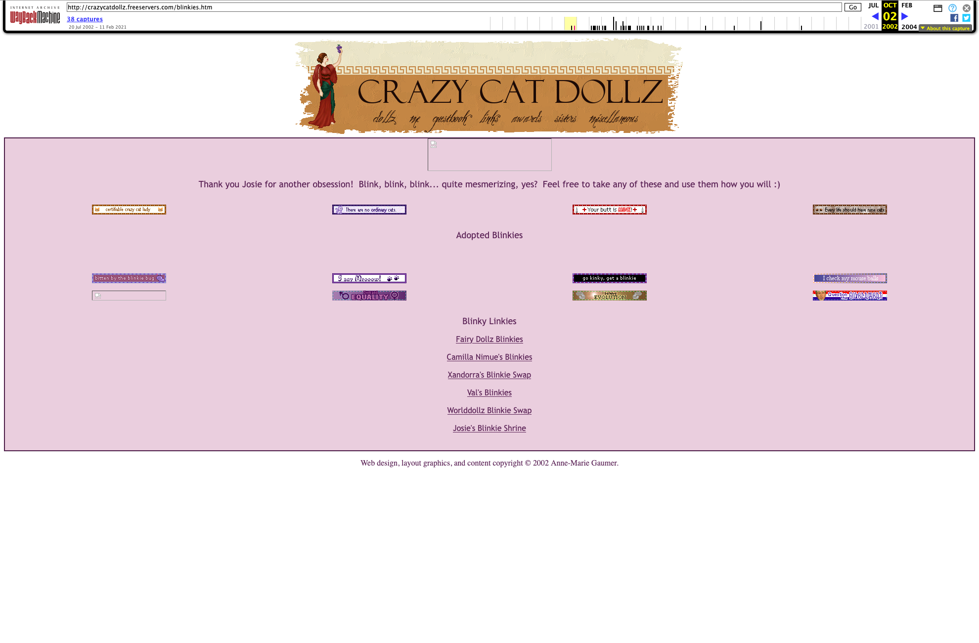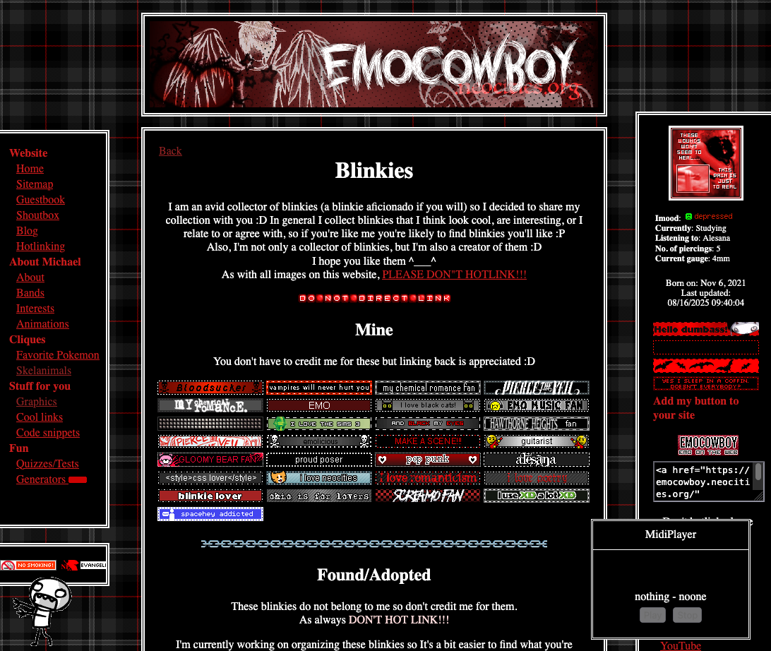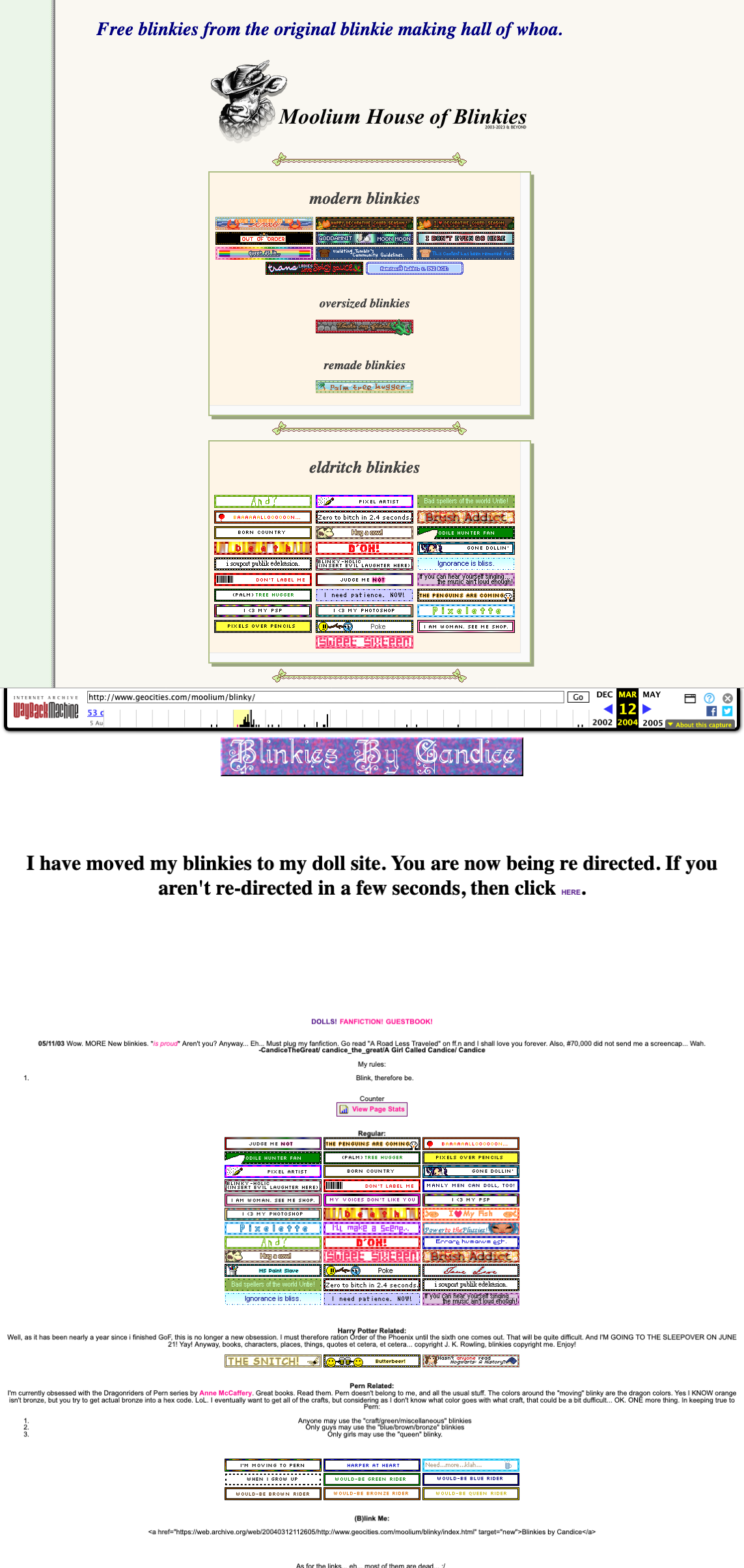 Welcome to Blinkie.World, my blinkie collection site! Here I aim to collect every blinkie on earth, while making sure all of them are credited to their creator! Many of these blinkies are from sources that no longer exist, so this not only a directory, but also an archive! Here, these blinkies (and who created them) shall be immortalized forever!