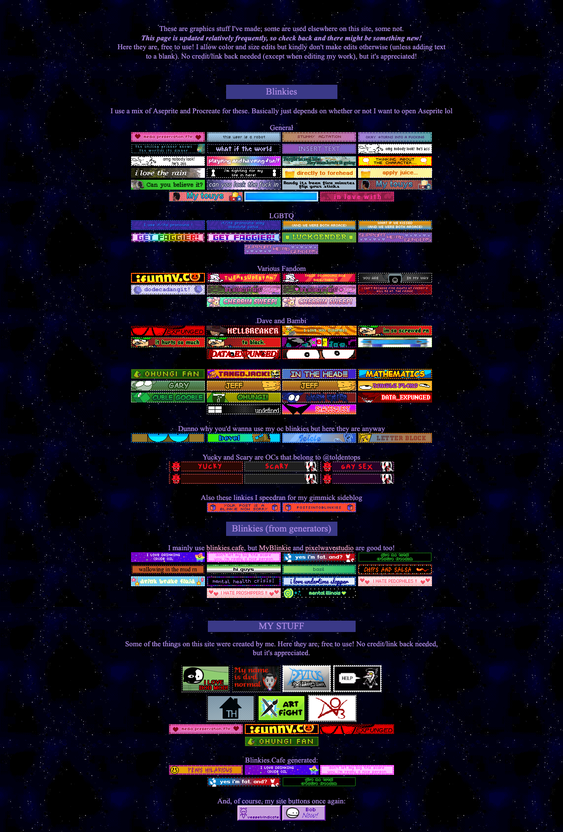 The vast majority of these blinkies are NOT made by me. Please do not download the blinkies here without visiting the original creator first! Many of these creators require credit or more, so I ask that you respect that, and check their individual requirements before downloading. Besides, if you like their blinkie, I encourage you to show them some love!